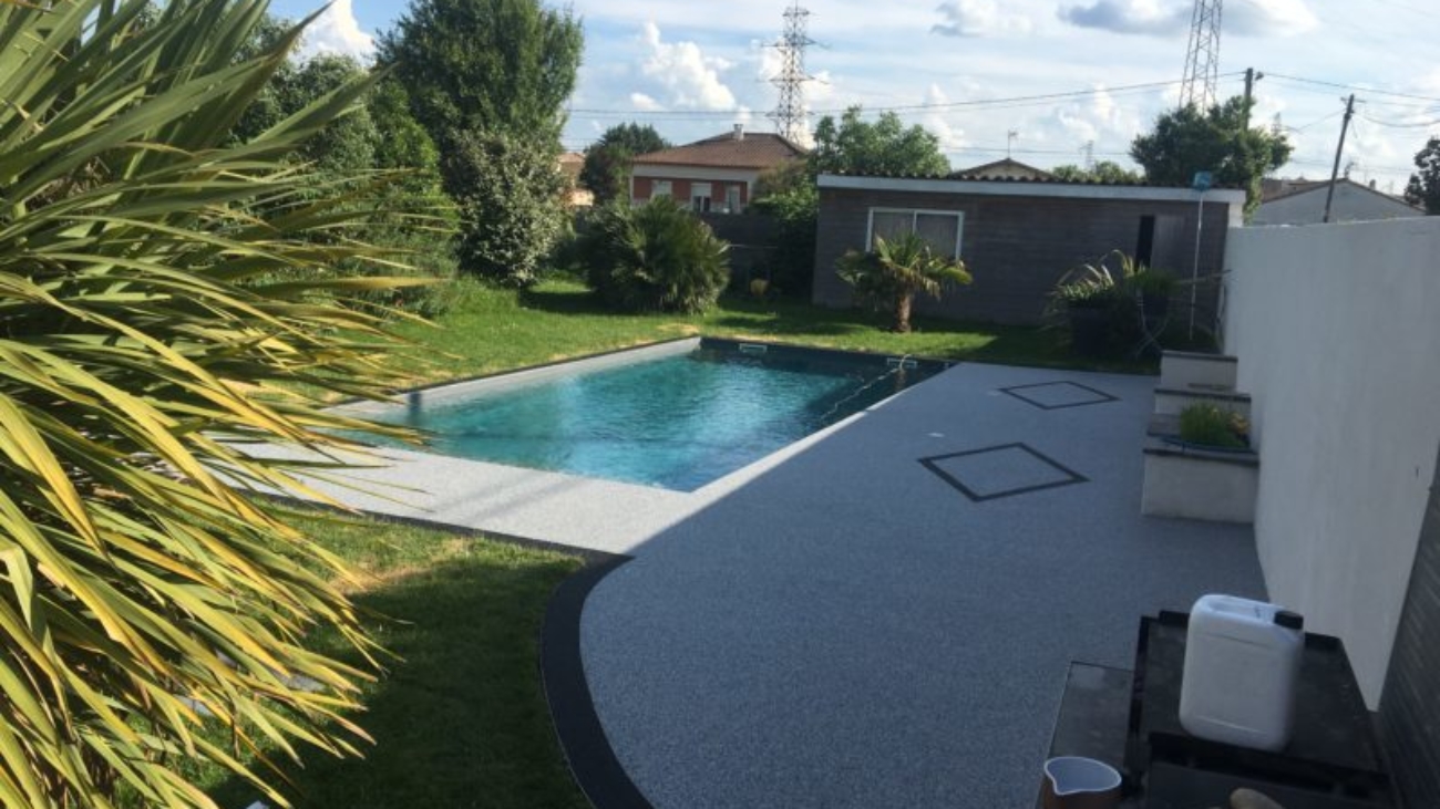 Dans cette rénovation de terrasse extérieure en résine de quartz, nous avions un avantage de départ…la dalle était propre et prête.